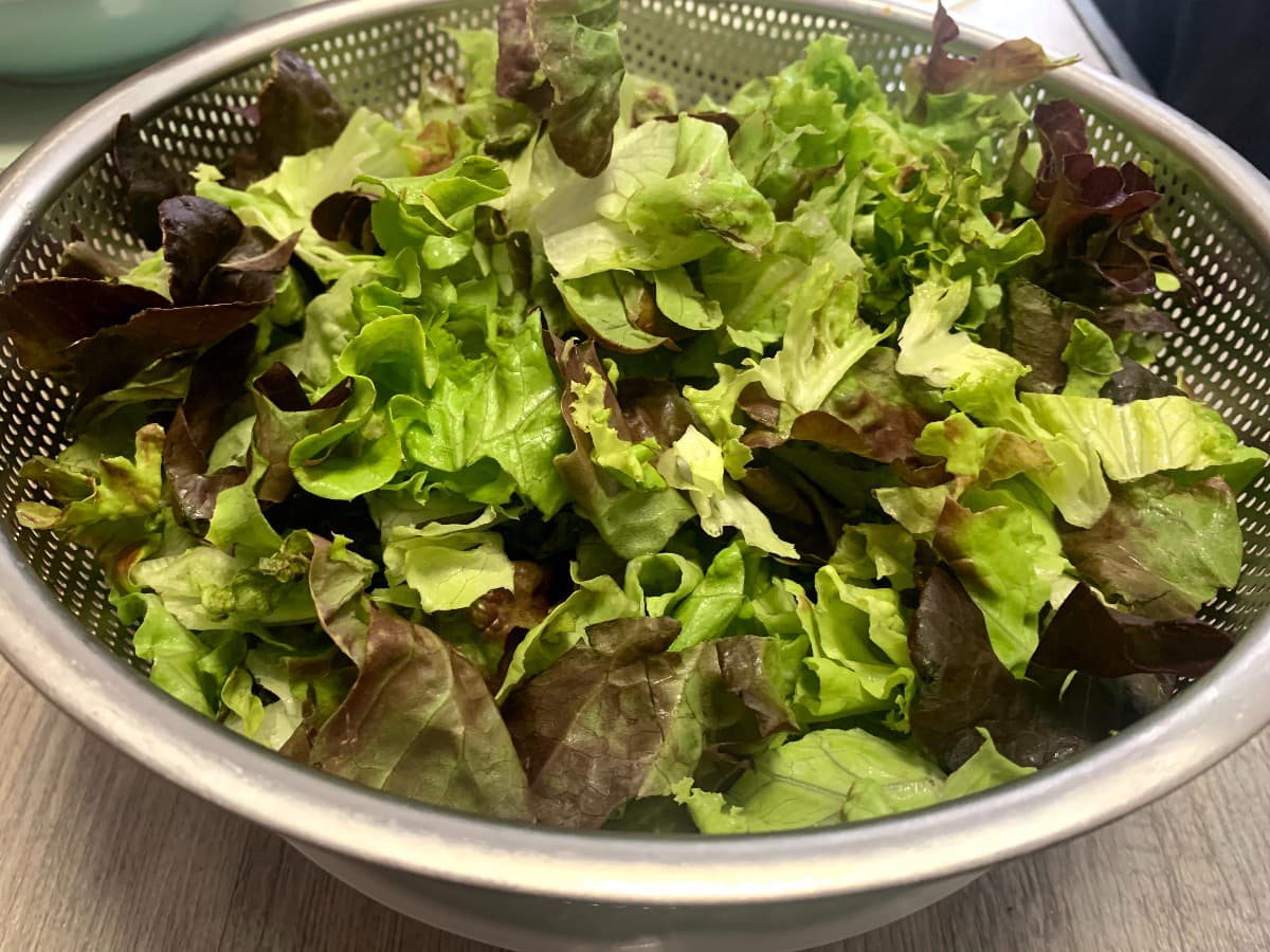- 200 gramos de lechuga variada (romana, hoja de roble, lollo rosso, etc.), fresca y crujiente, lavada y escurrida a conciencia.