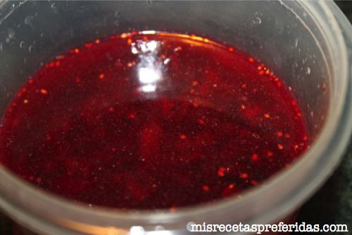 En primer lugar poner los arándanos deshidratados troceados en un bol con un poco de agua yo le he echado unas gotas de colorante rojo para que cojan más color, y dejar de 5 o 6 horas dentro de la nevera.