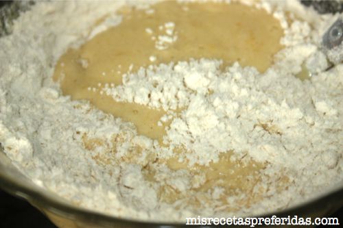 Y luego añadir la harina, y la levadura tamizada y mezclar de nuevo.