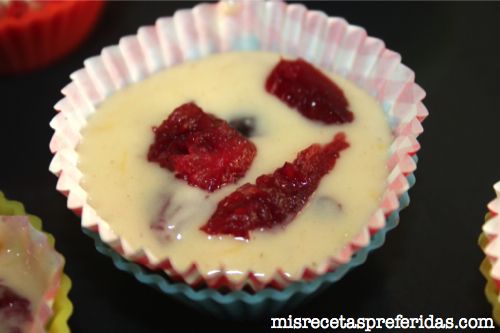 Finalmente cuando estén llenos echar unos trozos de arándanos por encima de la masa.