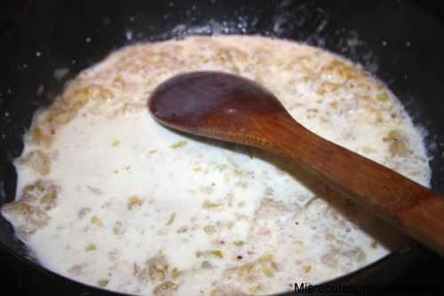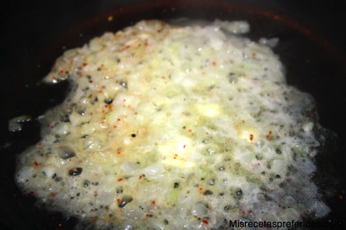 Partir la cebolla en trozos muy pequeños, y poner con la mantequilla en una sartén a fuego bajo con un poco de sal y pimienta para que se haga poco a poco