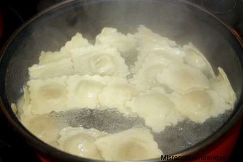Poner una olla de agua al fuego y cuando hierva echar un poco de sal y a continuación los ravioles