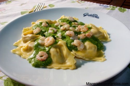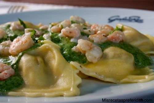 Servir los ravioles en los platos echar un poco de salsa de espinacas, y un poco de gambas por encima.